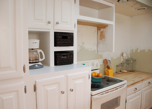 I realized I was being repeatedly drawn to small walls of open shelving among traditional cabinetry. Why fight it? I think I'm just going to remove that short cabinet over the butcher block counter entirely and put open shelving in its place; three floating shelves, probably.