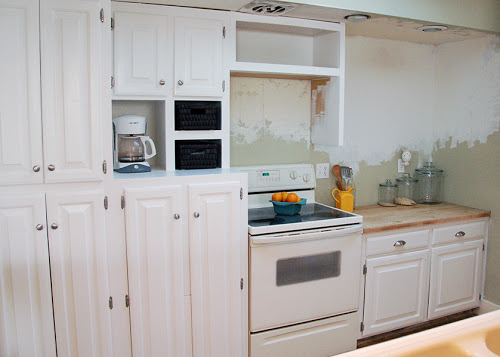 The halfway unpainted box is where our new over-the-range microwave will go and not match my bisque-colored oven.