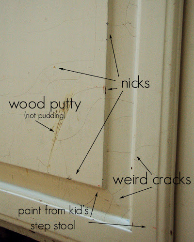 I can't lie, I have approached painting my kitchen cabinets again with a mixture of dread (obvious) and excitement (finally, it will look nice!) -- we just had them sprayed three years ago when we bought this home, and I've been unhappy with the finish for about 2 1/2 years. So even if I had wanted to keep the creamy off-white color, which I don't, I would need to paint them again because of the large amount of nicks and hairline cracks they have accumulated.