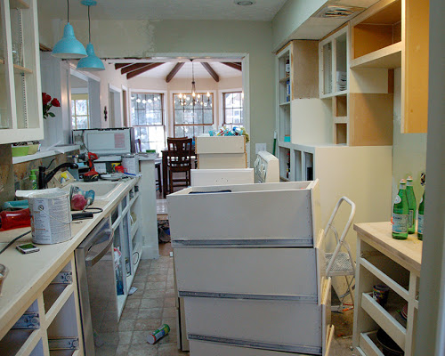 On Monday I bought my new fancy paint and started painting my cabinet frames, since I still couldn't look at my messed up doors without my eyeballs starting to twitch; I needed to make some actual progress before I would be emotionally ready to tackle those again!