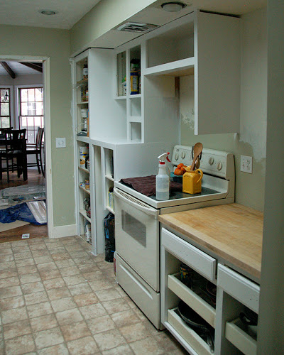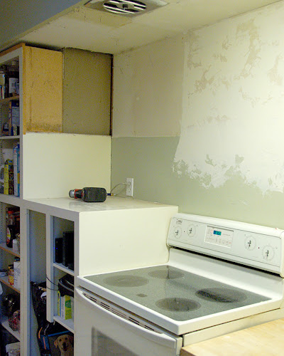 Today was the day for removing cabinet boxes. Before any open shelving can go in, the wall behind this cabinet box needs to be textured so it will match the existing walls. And on the other side of the kitchen is a second spot that needs to be taped and textured, where the tall glass front cabinets used to be. I'm hopeful we can get that taken care of soon and get some shelves made!
