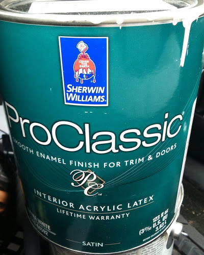 When I painted them last time I didn't researchat all thoroughly enough and I chose a latex paint; this time I'm pulling out the big guns and going for a really durable oil-based, self leveling one. I saw it recommended on a DIY forum for kitchen cabinets, and I asked the paint guy at my Home Depot and he agreed that it would work. I had it tinted to match my trim. So here goes nothing!