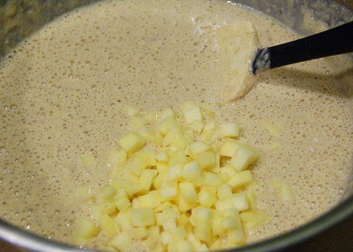 Mix your pancake batter like normal: wet into dry, stir until barely moistened (recipe follows below). Then gently fold in some diced apples right before cooking (I'm sure you could substitute grated ones too if you preferred).
