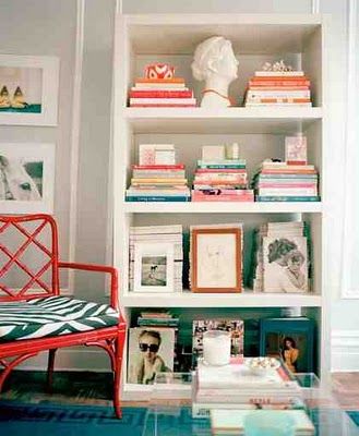 can stick 'em on a bookshelf. Vary the heights of books next to each other, turn them on their sides and stack them horizonally, lean a grouping against the side of a shelf, and add decorative items for visual interest. Get creative! I've seen people cover all the books on a shelf with paper so they look the same, or group them by color like in the photo above.