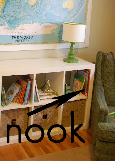 The problem is there's already a little reading nook action happening in this other corner -- there's a chair, a window with natural light (and a lamp! It's a two pronged lighting attack!), and books... so I'm feeling like another nook mere feet away might be nook overkill.