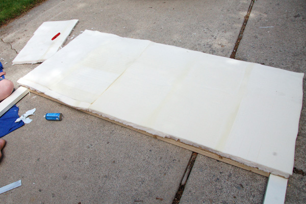 Next I used spray adhesive to adhere a layer of foam to the board. To save money I purchased a full sized memory foam topper from Walmart for $30 and cut it up. Some people use electric knives to cut through foam but I carefully used a utility knife and it worked fine -- I would probably advise against cutting with regular scissors as the edge will look very ragged and that will be noticeable under the fabric.