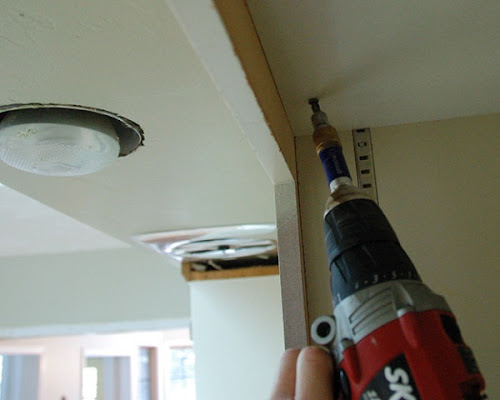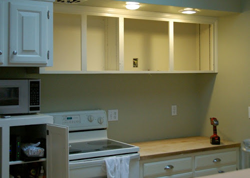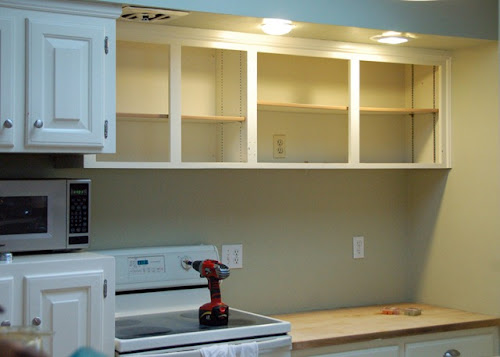 Long story short, I've decided to mess with my kitchen even more. That's how a person such as myself moves from simply adding a shelf below a cabinet to removing half a wall of uppers. I think it takes a certain amount of bravery (foolishness?) to start pulling out kitchen cabinets, but I've seen enough people who are wonderfully happy with their decision to add some open shelving, and it seems like a genuinely good solution to my out-of-proportion cabinet problem, so I've decided to just go for it.