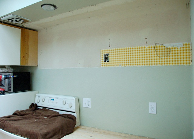 The halfway unpainted box is where our new over-the-range microwave will go and not match my bisque-colored oven.