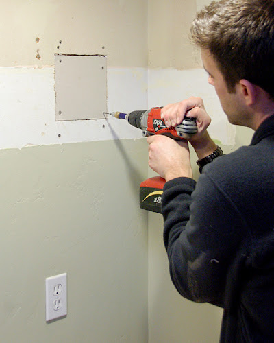 And Mike patched the sheetrock (The fact that he's helping me a bit with this project gives me warm fuzzies all the way to my toes. I heart him and his DIY-hating ways).