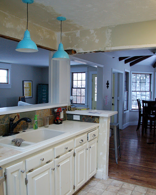 Today was the day for removing cabinet boxes. Before any open shelving can go in, the wall behind this cabinet box needs to be textured so it will match the existing walls. And on the other side of the kitchen is a second spot that needs to be taped and textured, where the tall glass front cabinets used to be. I'm hopeful we can get that taken care of soon and get some shelves made!