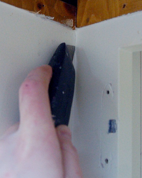 Next I used a utility knife to score the seams between the trim and wall, and also between the cabinet box to be removed and its next door neighbor. This step makes removal easier and helps minimize any potential damage to the surrounding walls or cabinets.