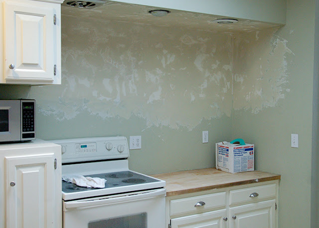 Last Saturday, I rolled up my sleeves and removed a couple of cabinets in my kitchen, and was left with a little mess to clean up. I can do a lot of things, but mesh tape + joint compound + fancy textures isn't on my list of skills. (although I do have nunchuck skills, bow hunting skills, and computer hacking skills... Mike only wanted a wife who had skills.)