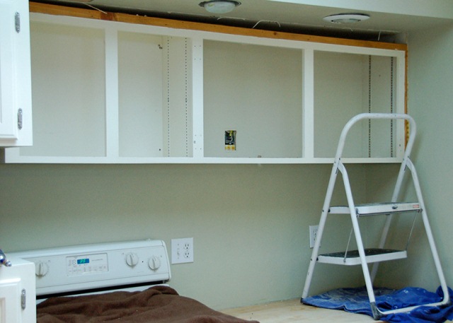 Problem #3: At the same time the crackling paint disaster of 2013 was happening, our contractor buddy came over to put a cabinet box above my range to mount the microwave to, and when he got here we realized the cabinet next to it was too deep for the microwave to open... so he had to rip out yet another cabinet, cut it in half and replace it before he was able to even get started.